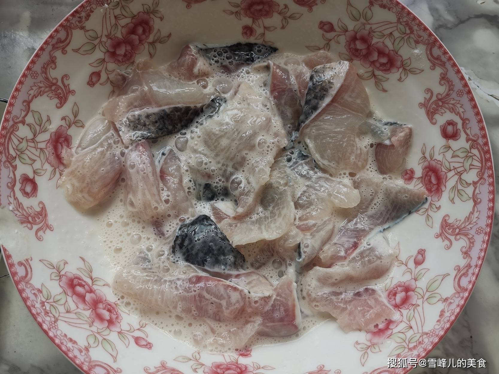 第三步:把鱼片中放入一个蛋清和少许红薯淀粉抓匀腌制10分钟。腌制鱼片的淀粉一定要选择红薯淀粉,红薯淀粉的黏性比较高,鱼片不易碎。