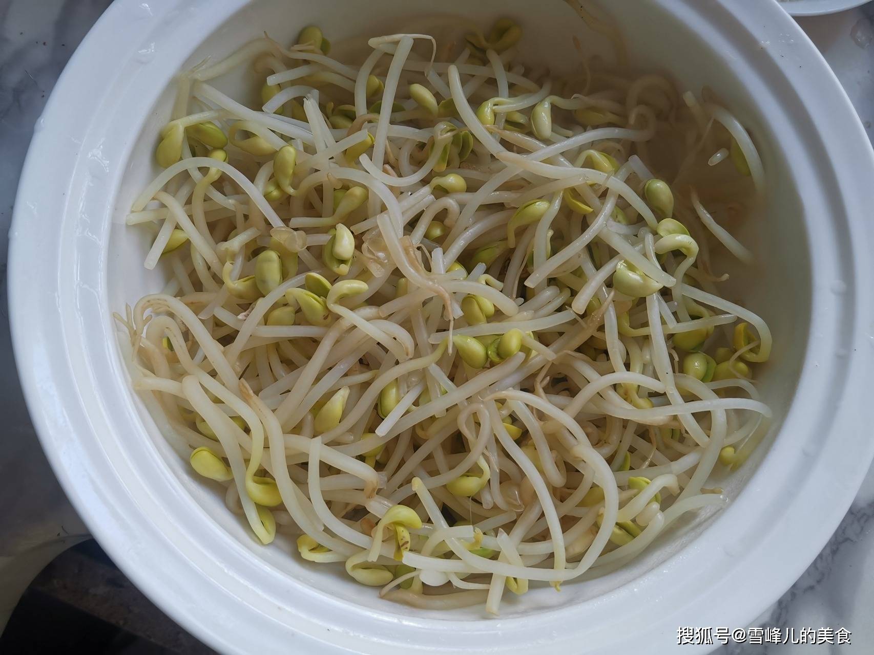 第七步:把黄豆芽放到开水中烫熟捞出,直接放入盆中。如果不喜欢黄豆芽也可以用其他蔬菜来搭配,家人喜欢即可。