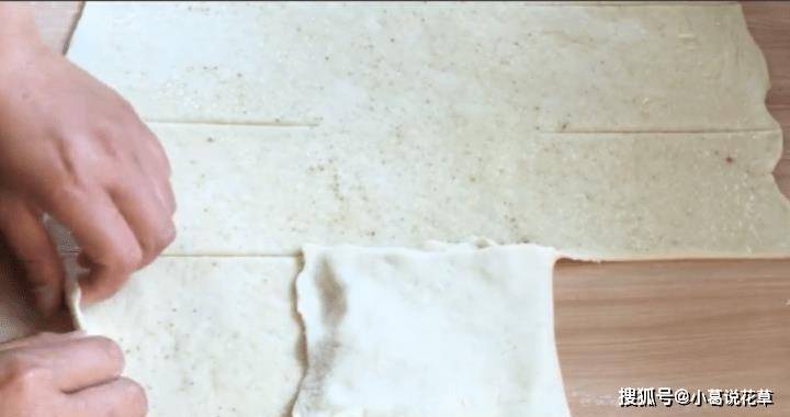 2、时间过去后,如果看到面团有丰富的蜂窝状组织,就说明已经醒发了。案板上撒上干面粉,取出面团,揉匀,让空气逸出。然后擀成厚约2毫米的大饼。在卷好的皮革上盖上一层面团,撒上盐和胡椒粉,在皮革上对称地划出一条口子,将其沿彼此折叠,用力压紧皮革的边缘,然后用擀面杖小心地擀开,确保保持双方。