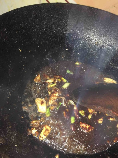 12.锅内重新放入花生油烧热,放入切好的葱花和蒜炒香。