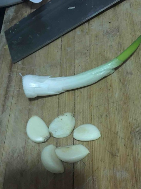 3.葱花洗净,蒜剥好切片备用。