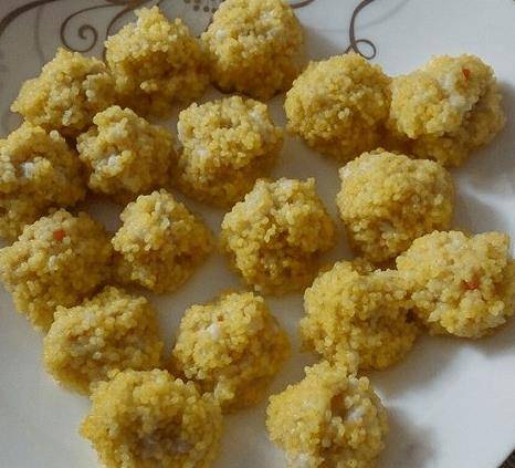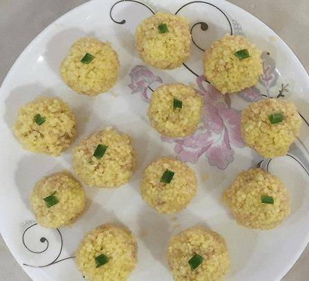 4. 将肉馅搓成小丸子,沾上一层泡好的小米,放入蒸锅中蒸20分钟。