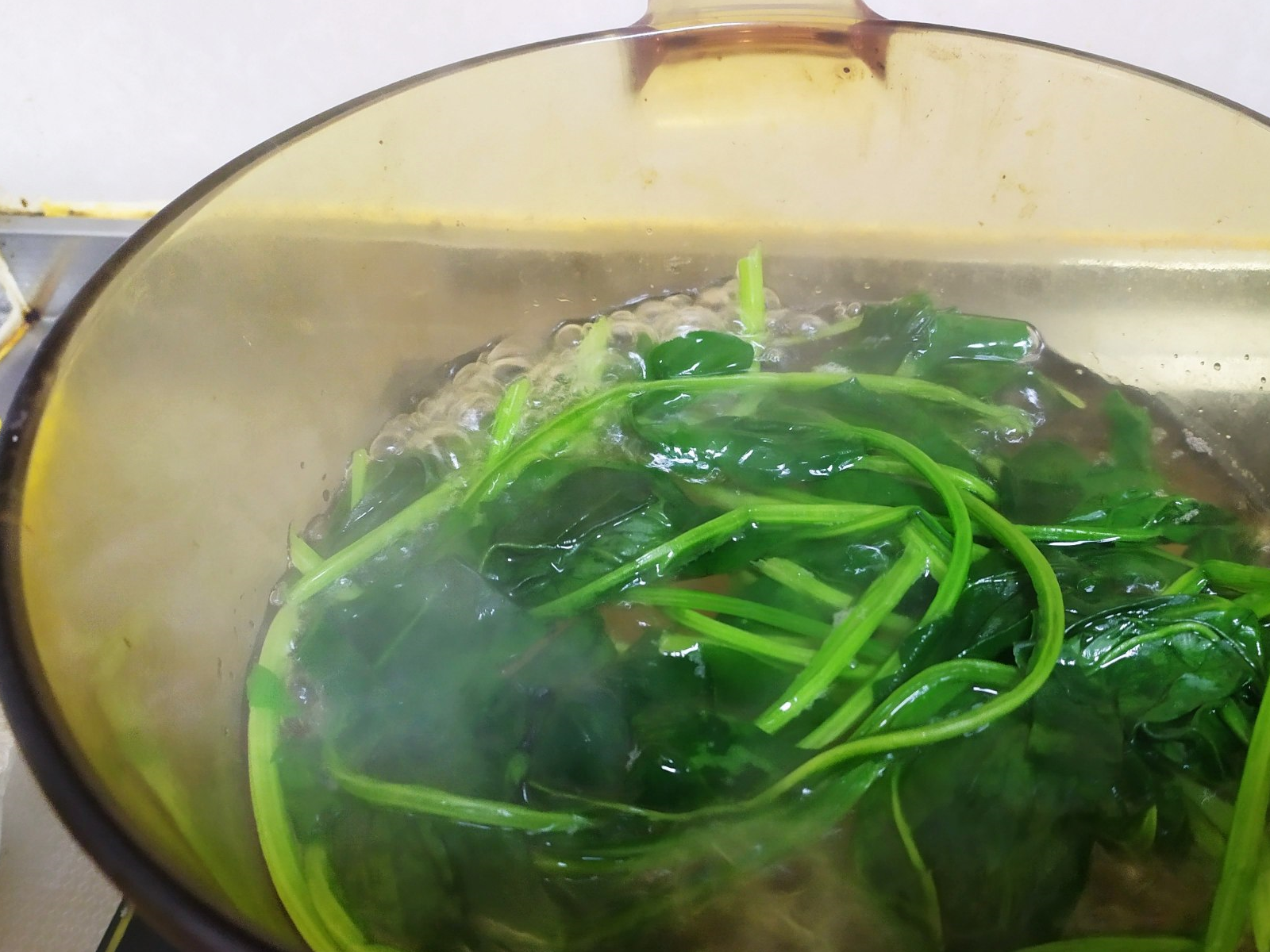 4、菠菜洗净后,锅中烧适量开水,加入菠菜,焯30秒,捞出裹一下凉水;