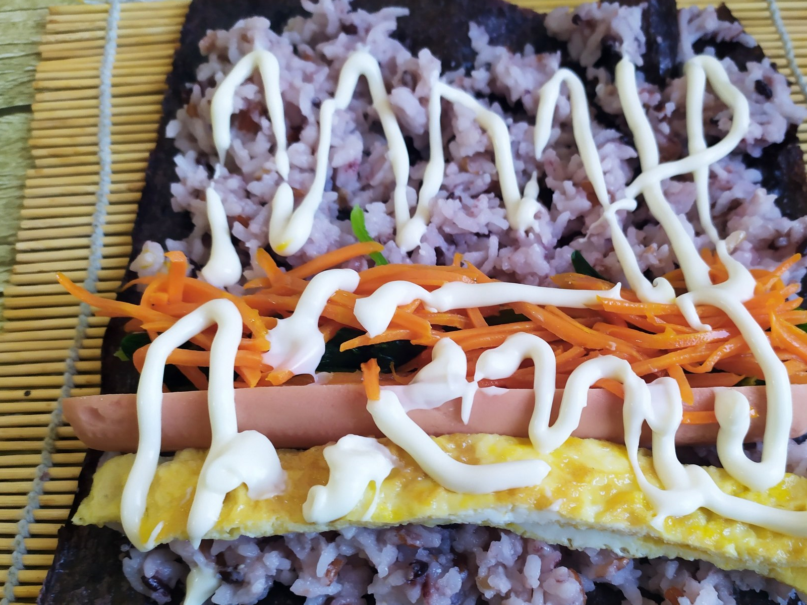 所需食材:米饭3碗、火腿肠1根、鸡蛋2个、胡萝卜半根、菠菜1小把、沙拉酱适量、寿司紫菜3张、寿司醋少许,橄榄油少许