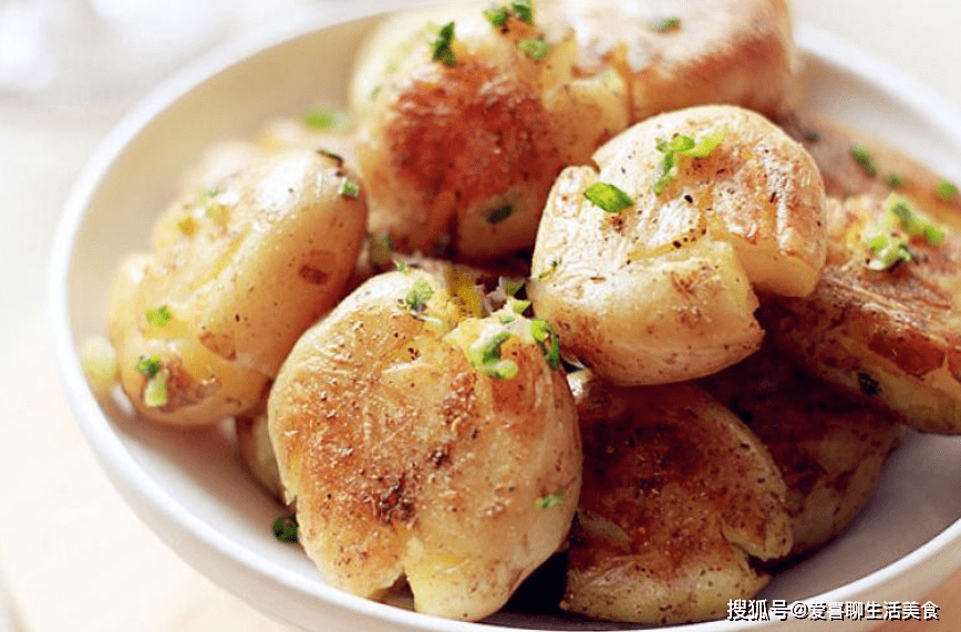 3,锅中加入少许食用油,油热后放入压扁的土豆,煎至两面金黄,撒上椒盐粉和葱花拌匀,即可出锅,真的好香好好吃的。