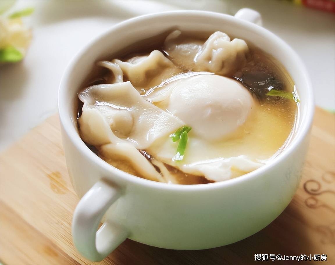 接着放入馄饨进去煮,再放入紫菜,煮好后捞出,盛一下汤。最后放入生抽、盐、香油、葱花,就可以食用了。