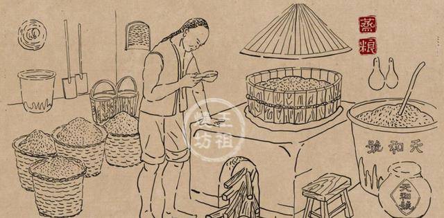 “9”就是指九次蒸煮,原料投料后,下沙清蒸一次,沙混蒸一次,此后只加大曲不再投料。沙混蒸后的醅料上甑烤酒为第三次蒸煮,且第三次蒸煮后的醅料为熟糟,熟糟经摊凉→拌曲→堆积→下窖→封窖发酵→开窖取醅→上甑烤酒六个轮次循环,共九次蒸煮。
