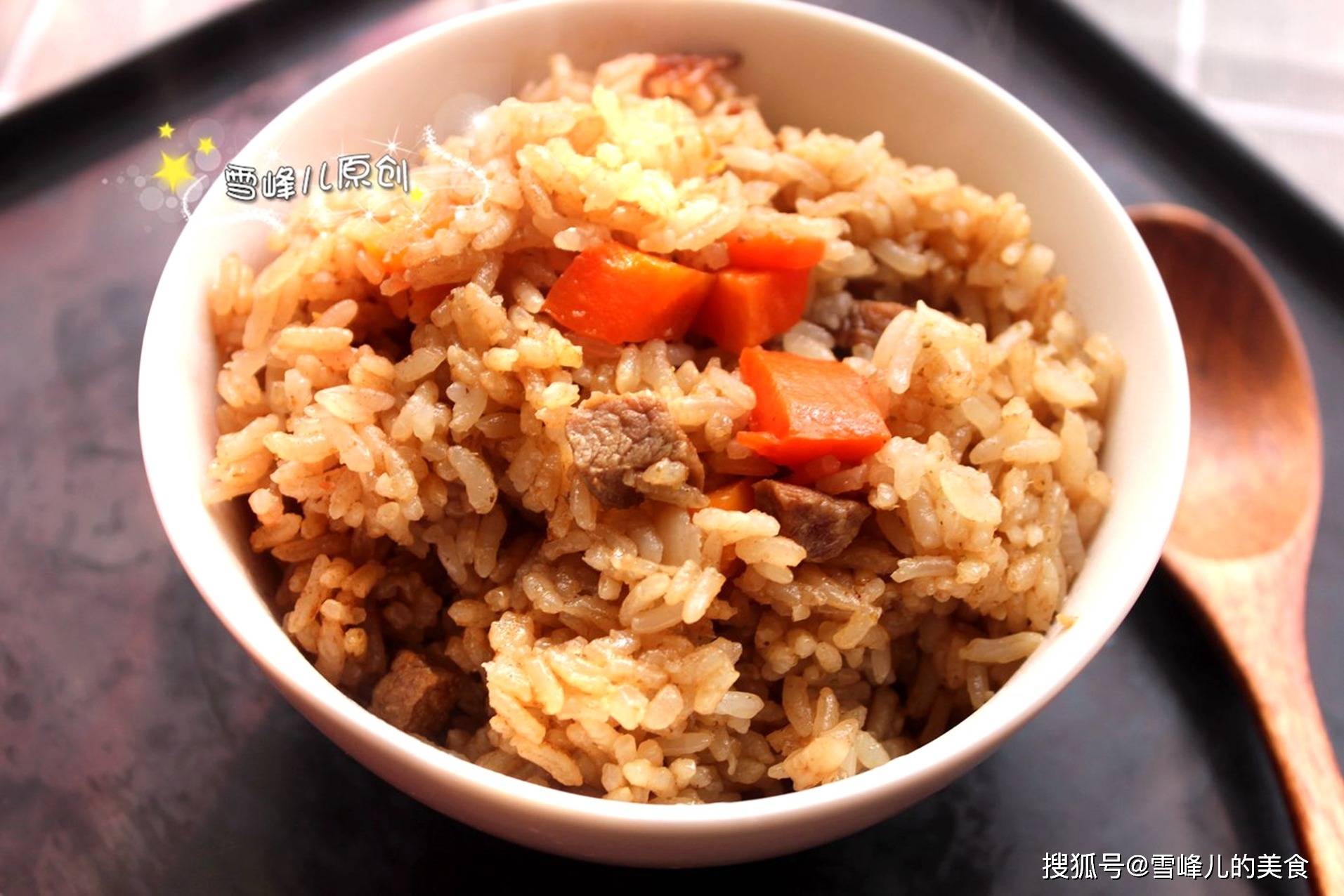 2,最后倒入胡萝卜煸炒,加盐和酱油调味再加入孜然粉炒匀,倒入大米,加上少许水,倒入电饭煲,开米饭键即成。
