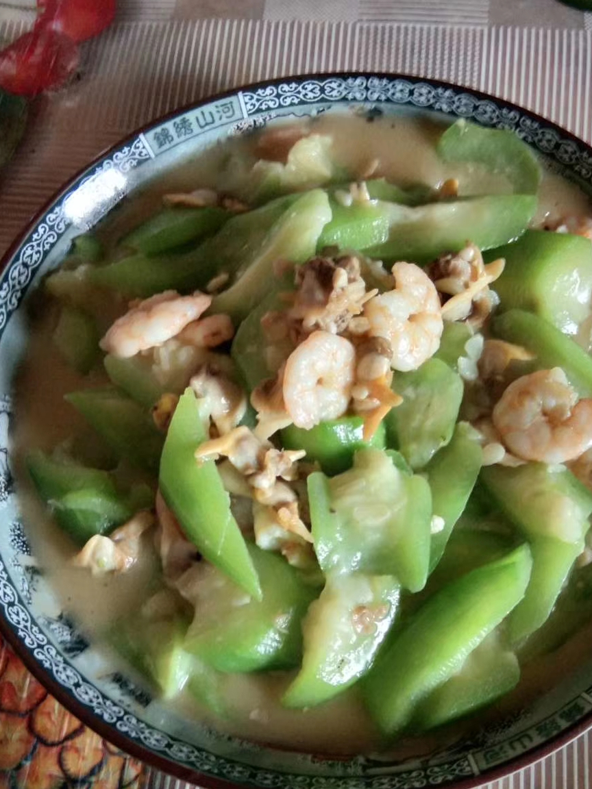 1、将虾剥去虾壳,花甲螺去壳取出螺肉然后洗干净,在后再把丝瓜切小段,蒜拍末备用。