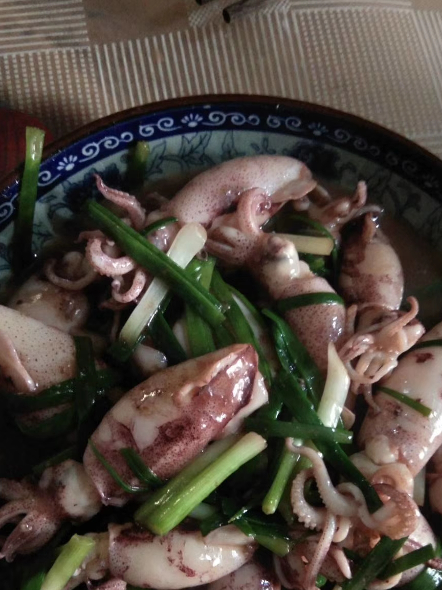 2、锅中放油,然后把鱿鱼倒进锅中,加入米酒大火翻炒25秒,然后加入葱白继续翻炒,炒好后加入少量的水焖1分钟。