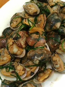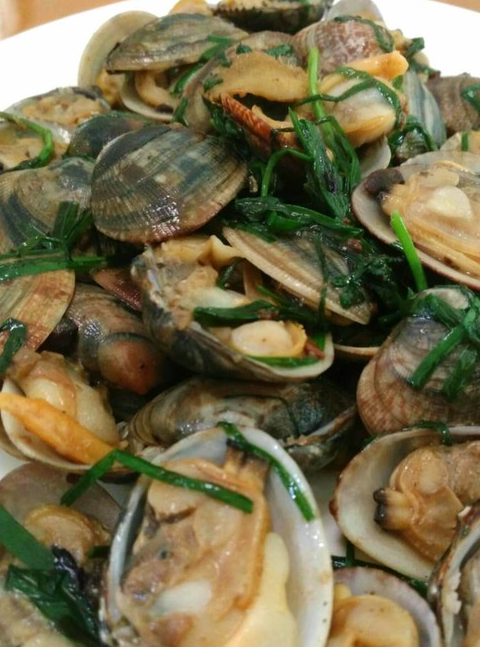 蛤蜊1000克、韭菜50克、花生油3克、精盐2克、蚝油5克、料酒适量、姜5片、蒜1粒