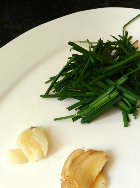 2.韭菜切段,姜切片,蒜瓣拍扁