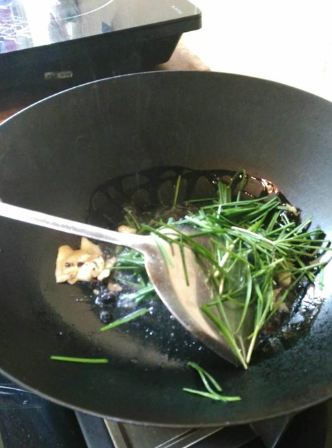 9.加入姜、蒜和韭菜爆香