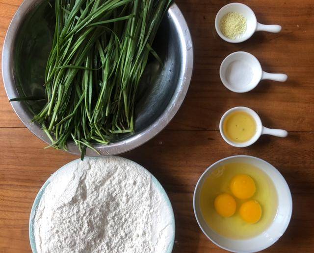 韭菜300克、面粉200克、鸡蛋3个、食用盐2勺、花生油20克、鸡精1勺。