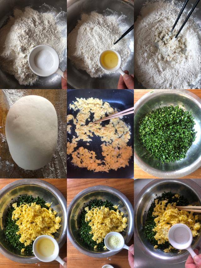 2、鸡蛋炒熟,韭菜切成末,全部放入盆中,加入1勺盐、1勺鸡精和1勺花生油拌均匀。
