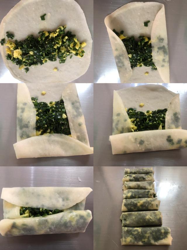 6、在面皮中间放上调好的韭菜鸡蛋馅,先把两边往里折叠,然后底部往上折叠,最后顶部也往里折叠,成为长条形状。