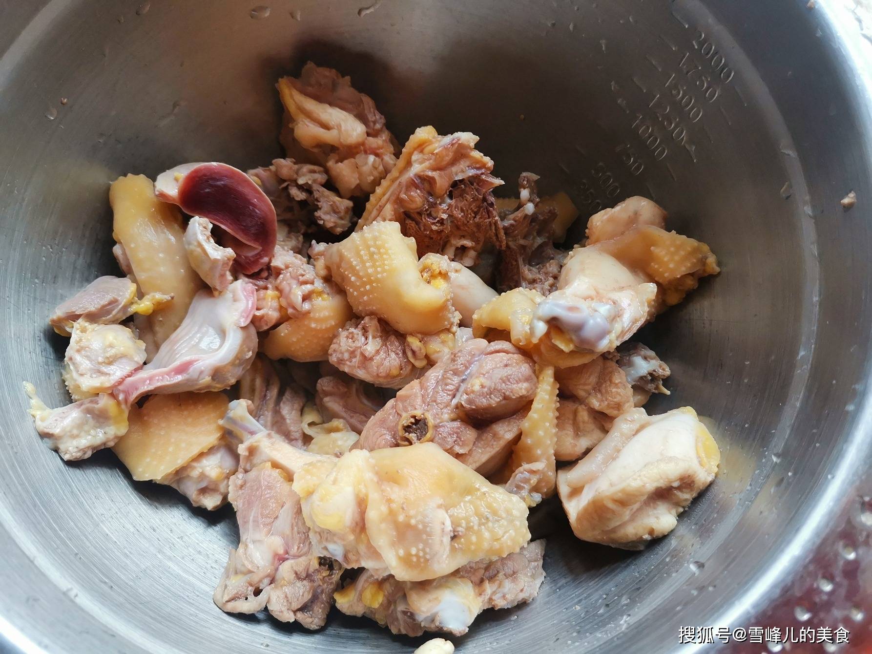 第一步:买当年家养的鸡,宰杀干净剁成小块,放到锅里焯水备用。家养的鸡和养殖的鸡味道和口感都是不一样的,我们在买的时候尽量买家养鸡,价格虽稍贵,但是好吃营养是关键。