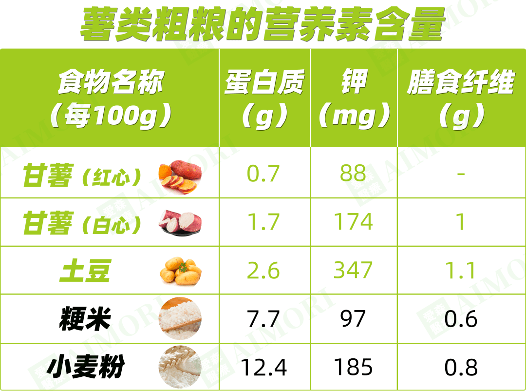 从上图可以看出,薯类粗粮相比大米、面粉的营养优势,但甘薯(白心)、土豆的含钾会相对高一些。因此,推荐大家: