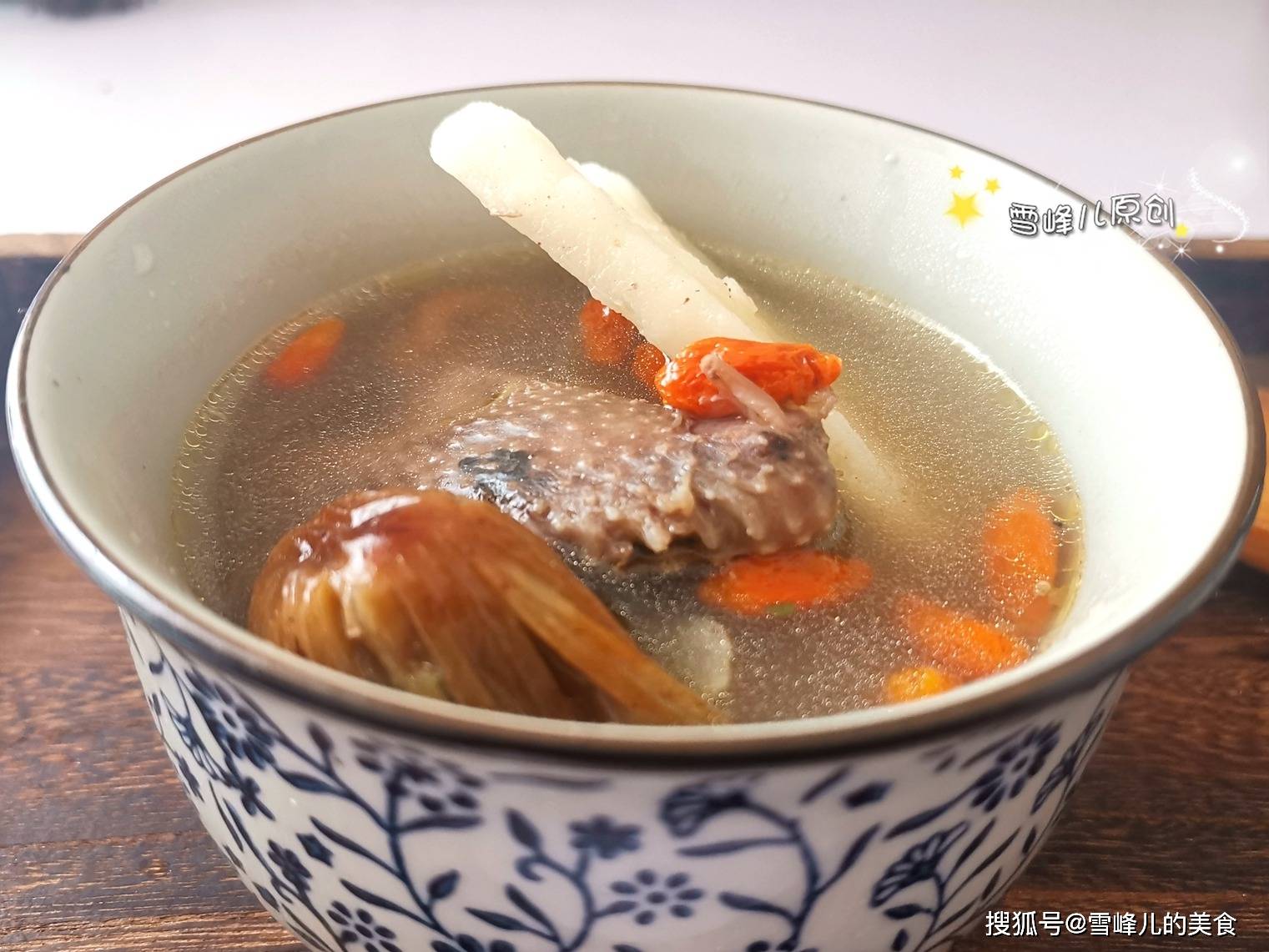 2,改成小火用勺子慢慢撇去浮沫,慢慢熬制到汤浓肉烂时,把枸杞加入,再加入盐调味,出锅即成。