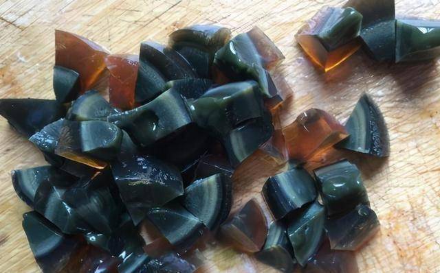 第三步,将皮蛋去皮并切成大块。将皮蛋、瘦肉、姜末放入碗中,加入少许盐、白糖和少许植物油,加入少许黄酒;