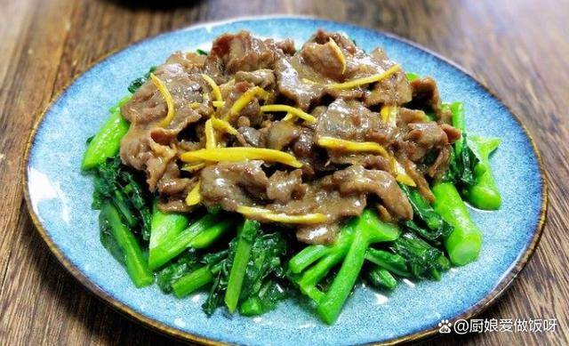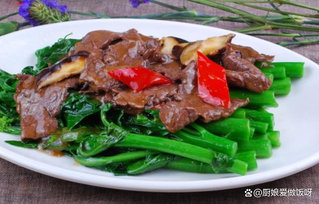 8.上菜:将炒好的雪花牛肉炒芥兰装盘,即可享用。