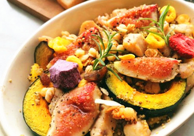 原料:南瓜、藜麦、鸡脯肉、甜椒、无花果、海盐、橄榄油、黑胡椒碎、迷迭香、果麦脆