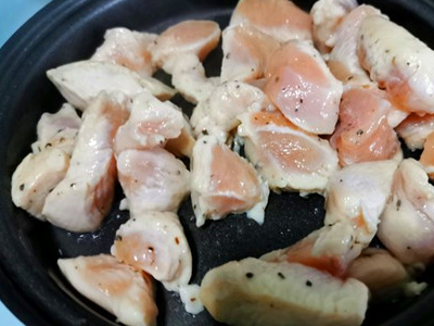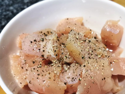 鸡脯肉洗净切块,放入海盐、橄榄油、黑胡椒碎腌制十分钟左右。