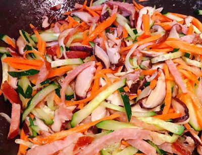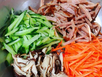 黄瓜、胡萝卜、香菇、香肠切成丝。