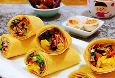 煎饼铺平,放入鸡蛋、蔬菜、葱、香菜卷起来切段即可。