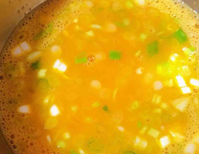 鸡蛋打散,放入香葱粒、盐搅拌均匀。