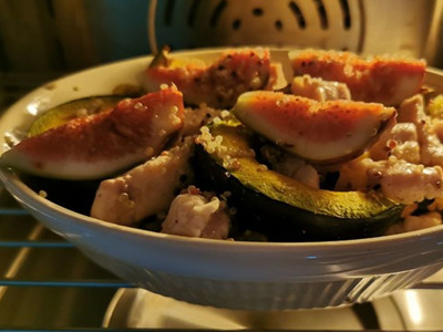 取出烤熟的南瓜,放入藜麦甜椒、鸡脯肉、无花果。