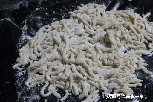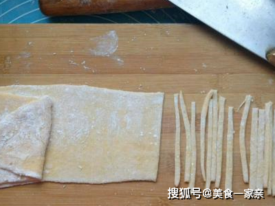 3、醒好后,把面团擀开,多撒点面粉,以防粘住,切成面条状,不要太粗,细点。