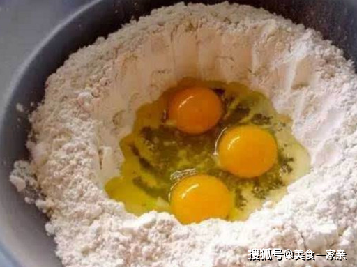 1、拿一个大点的盆,将面粉、发酵粉、放入盆中,然后打入两三个鸡蛋(看你做的量多少打入鸡蛋,量多适量加鸡蛋),混合搅匀。