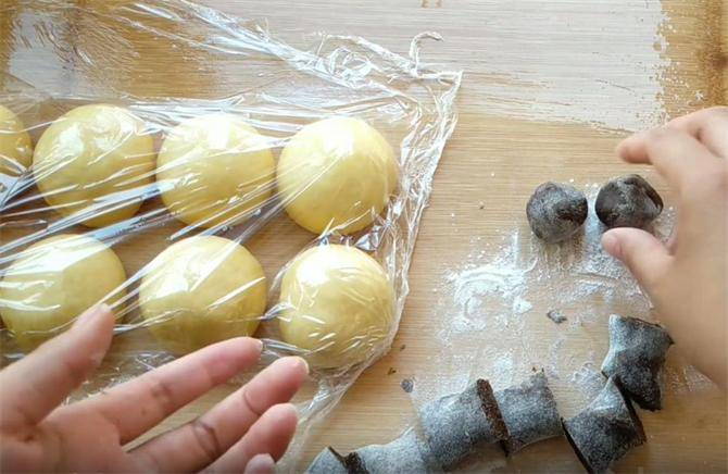 4.把做好的面剂盖上保鲜膜,因为这时温度比较高,容易干裂,然后把豆沙馅沾干面粉搓长,下成面剂搓圆备用。