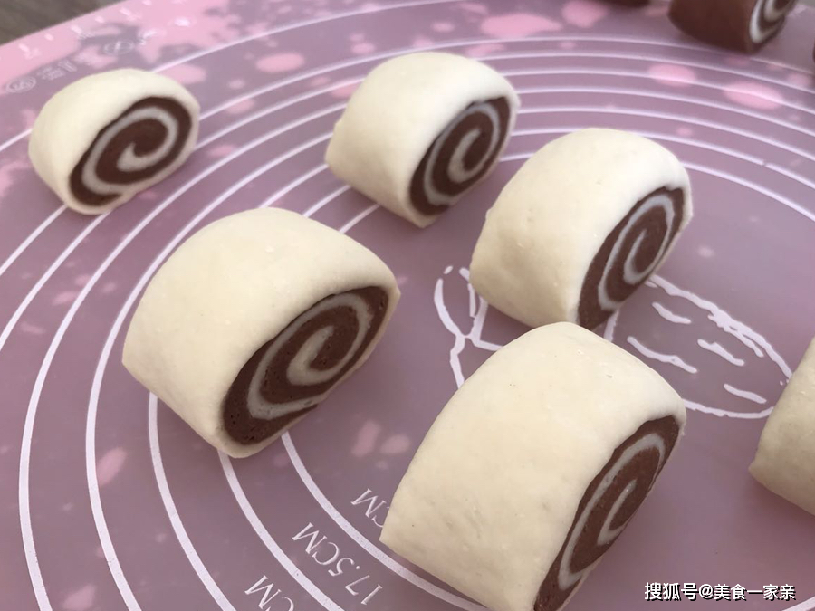 15.将卷好的圆柱体,切成小段,宽度可依据个人喜好决定,也就是馒头的大小,我们就得到棕色外皮的双色馒头