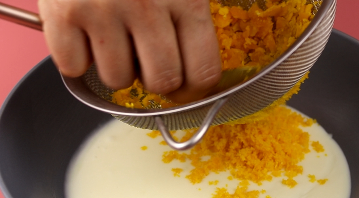 取四个咸蛋黄上锅蒸熟。取出,用勺子压碎,再用漏勺过滤一下,使咸蛋黄更加细腻。(咸蛋黄直接筛是筛不出来的,需要用勺子碾压漏勺。)