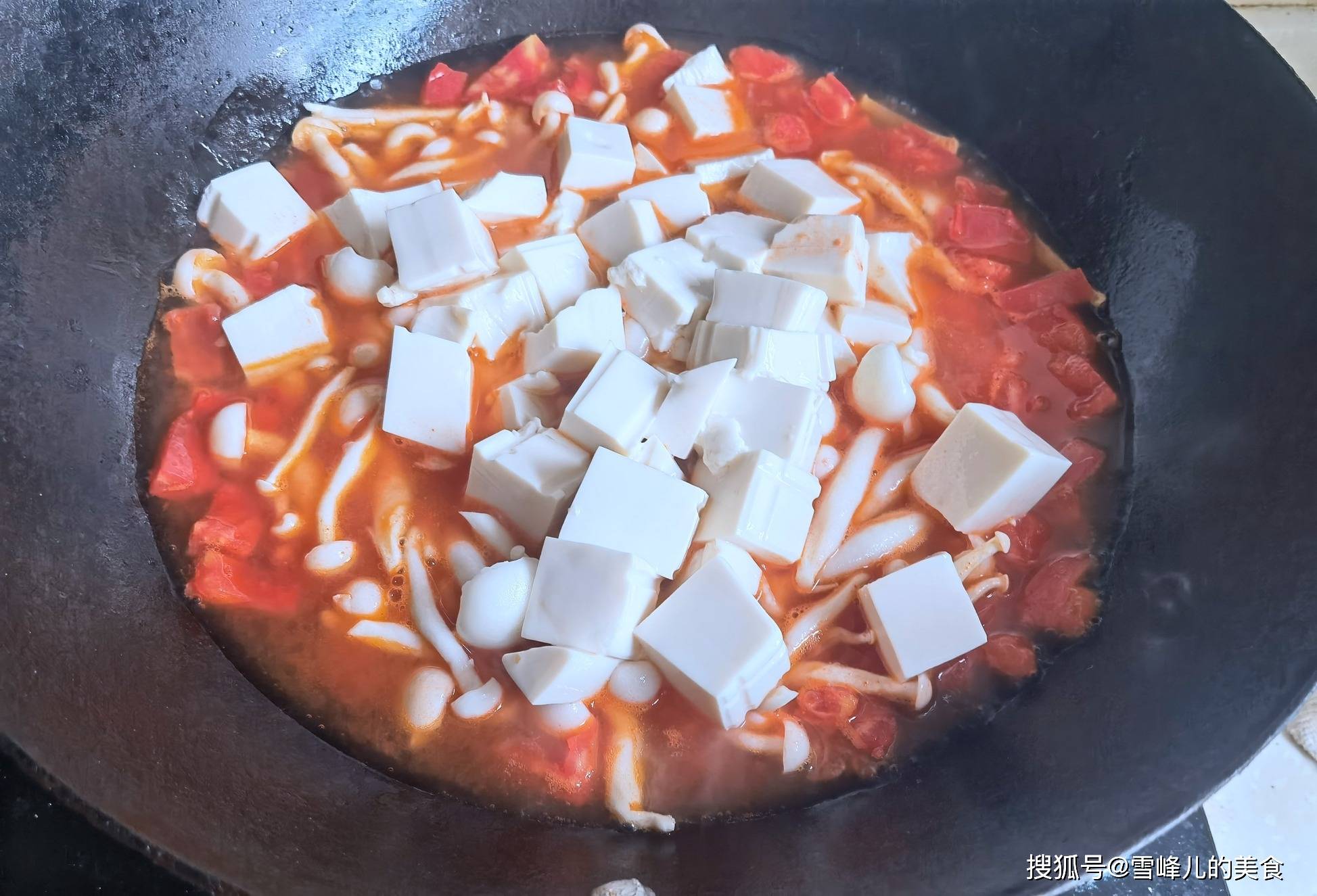 第三步:倒入白玉菇和豆腐,改成小火慢慢地炖大约10分钟。