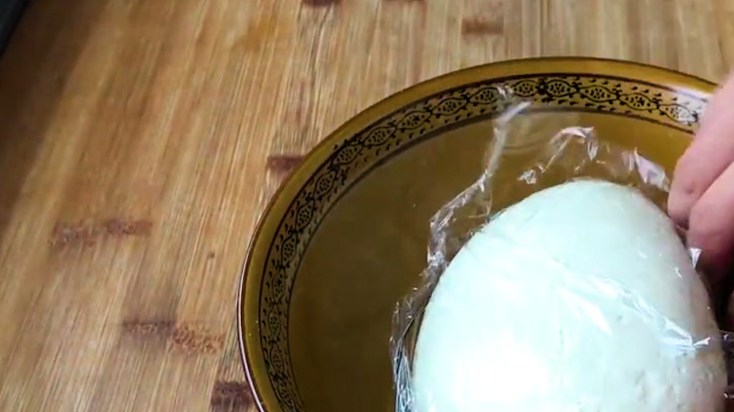 面团醒发好后,就把它拿出来放在案板上用手揉一下,再用刀给它分成两份,搓成长条分成大小相等的面剂。然后把每个面剂用手压扁,再用擀面杖擀成大的薄饼。