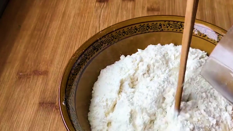 首先,准备一些面粉。我用的是最普通的面粉,如果想吃更筋道一点可以在里面加一点谷原粉,或者用高筋面粉。然后我们把一大半的面粉用80度左右的开水给它烫一下,因为开水可以破坏它里面的组织减少筋性。但是如果你全部烫面的话,那它里面就没有什么筋性,吃起来口感就不是太好,所以说我们一半用烫面,一半的用温水和面。这样做出的饼呢,柔软又筋道,就算是放凉了也不会发硬。面粉全部搅拌至棉絮状后就用手和一下,把这两种面均匀的揉在一起,合成一个光滑的面团,然后盖上保鲜膜醒发20分钟。