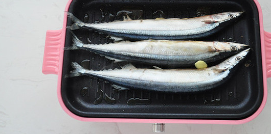4.放入腌制好的秋刀鱼改中火盖上盖子煎大约1分钟左右。