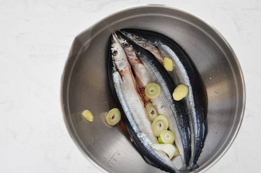2.秋刀鱼去除内脏后洗干净,放入葱姜料酒和食盐里浸泡半小时去腥。