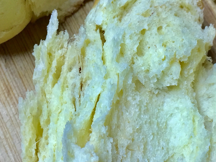 一款松软香甜、拉丝又可口的面包卷就制作完成了。因肉松在制作时没有放入多少,且在揉面时揉碎了,所以不见肉松踪影。