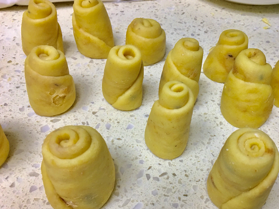 步骤11、然后从上至下慢慢卷起裹实,用刀从中间切开,变成两个面包生坯。然后把面团一个个做好,沾上少许面粉防粘。