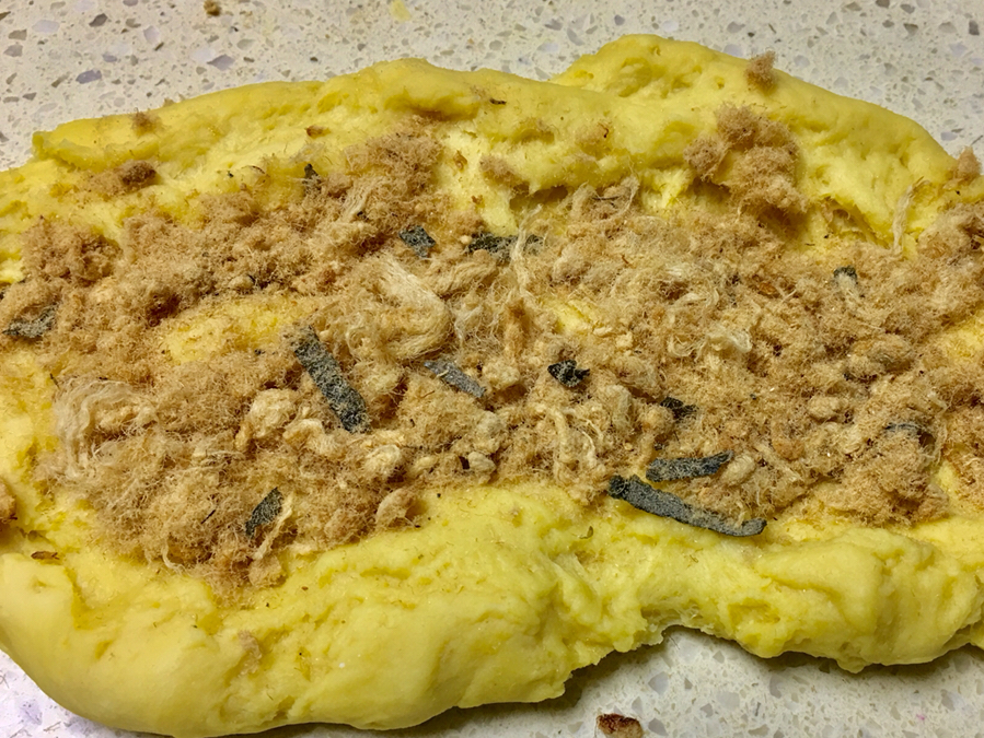 这款面包本来是要加入萄葡干的,但女儿说想试试肉松制作的味道,所以......,我觉得如果是你们要制作,还是加入葡萄干或是蔓越莓干比较好。合面是个体力活,如果不是经常制作面食的朋友最好使用面包机。