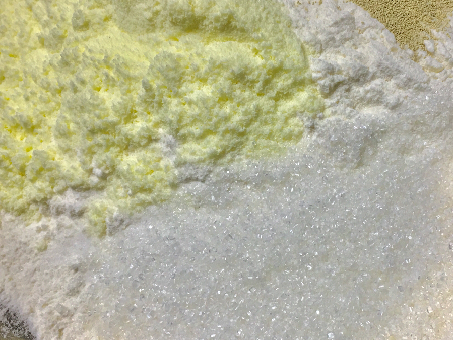 步骤2、在面粉中加入3克酵母菌、3克食盐、20克奶粉(增加奶香味)、30克白糖,糖的多少可根据自己口味来增减。