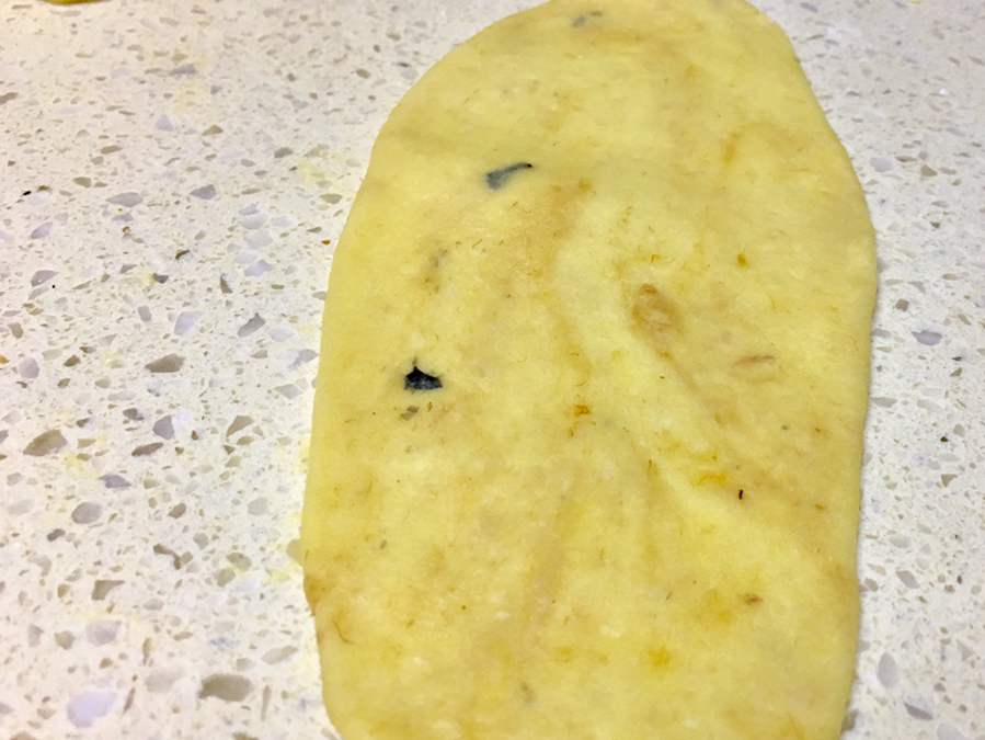 步骤10、取一个面剂揉成团后,用擀面杖擀成牛舌状。