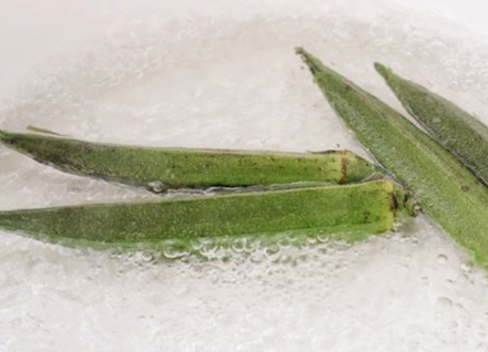 第二步,处理秋葵,秋葵洗净后放入锅中焯一下,去掉其苦涩之感,方可捞出切成块状