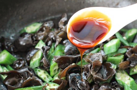 第四步,处理好木耳,要切成块,洗干净便可以下锅跟秋葵一起翻炒,这时要大火,而且要快速,不然停留久了皮会变老,炒至两分钟,再加些盐、耗油翻炒均匀即可