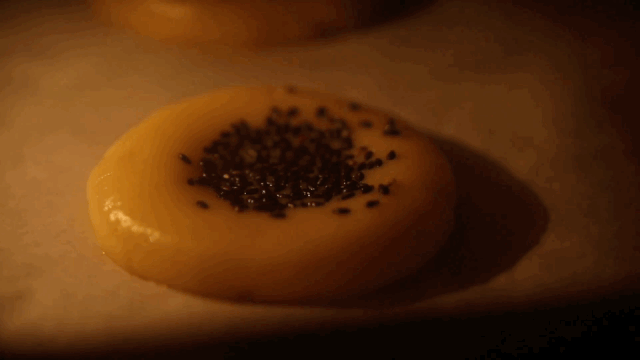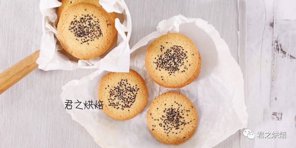 面团放在铺了硅油纸的烤盘上压扁,撒上黑芝麻作为装饰(用手压一压使黑芝麻贴紧在面饼表面)。