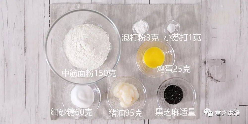 中筋面粉150克,细砂糖60克,猪油95克,鸡蛋(全蛋液)25克,泡打粉3克,小苏打1克,黑芝麻适量(表面装饰用)